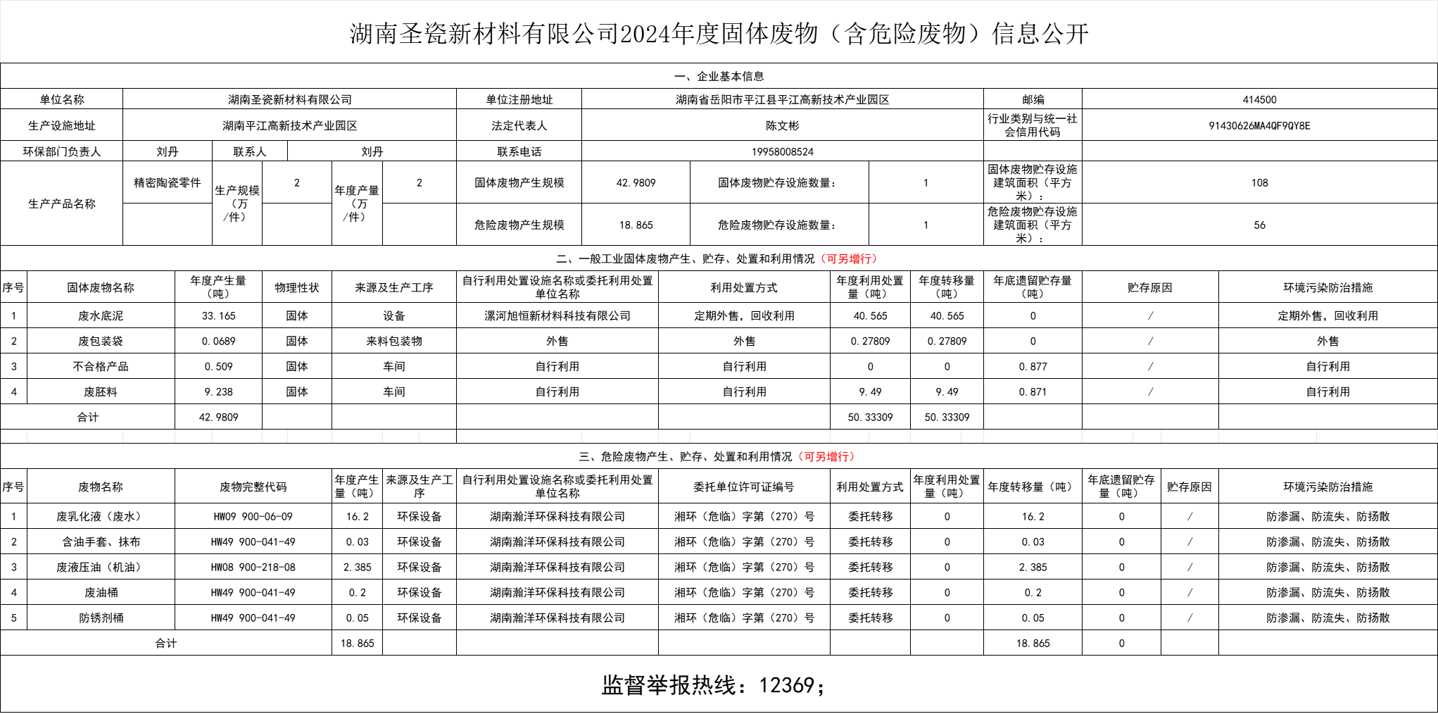 湖南圣瓷新材料有限公司2024年度固體廢物(含危險(xiǎn)廢物)信息公開(kāi)